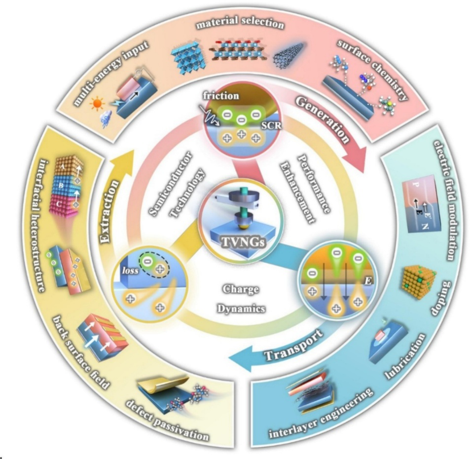 基于半导体材料的新型能量收集技术是被认为是缓解能源短缺问题的有效解决方案。其中,摩擦伏特纳米发电机(TVNG)作为一种耦合了半导体物理效应和接触起电现象的新技术,因其直接输出直流电、低阻抗和结构设计简单等独特优势而备受关注,在智能可穿戴、自供电传感及物联网系统等前沿应用领域潜力巨大。然而,TVNG仍在功率转换效率和电压输出方面存在局限,其主要受电荷载流子动力学的影响(主要涉及到半导体材料中的电荷生成、传输、提取等动态过程)。因此,如何调节电荷载流子动力学,特别是实现电荷产生、传输和提取之间的动态平衡,对高性能TVNG的设计及其多元化应用至关重要。